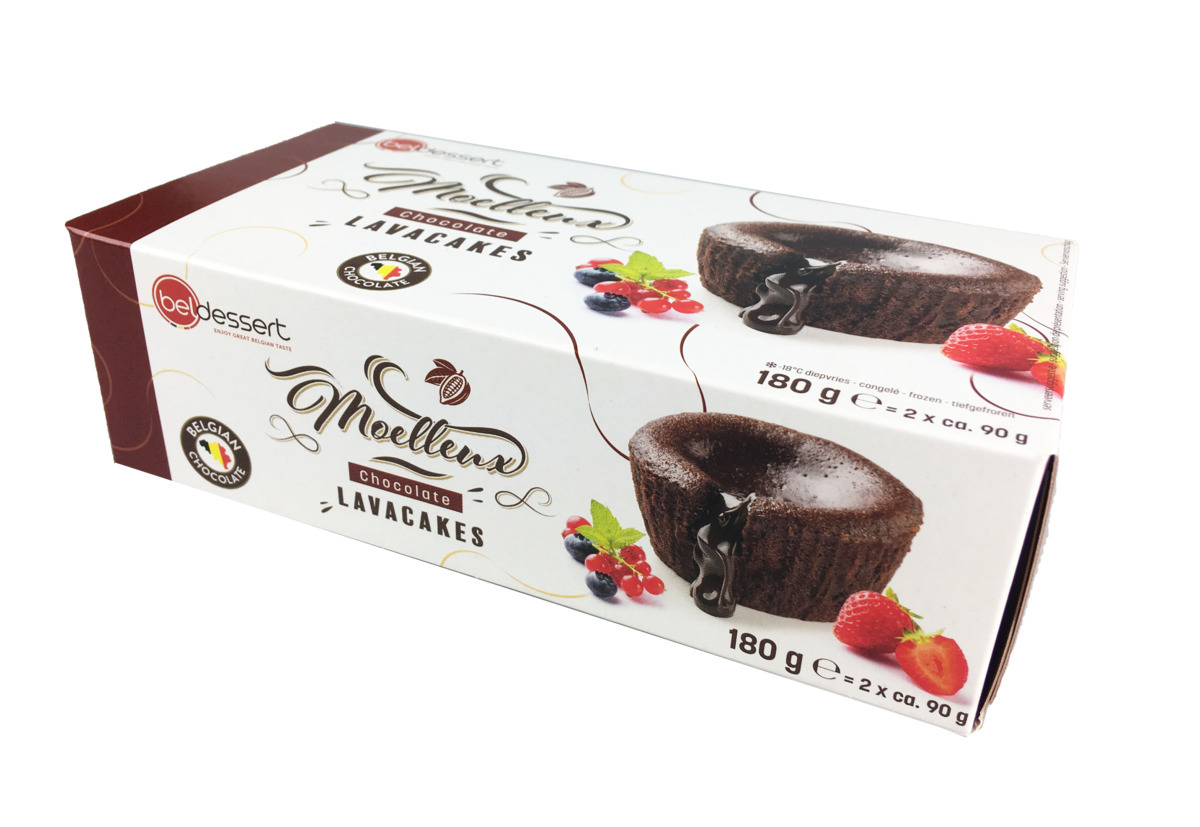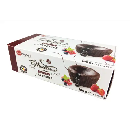 Súkkulaðikaka úr ekta belgísku súkkulaði með fljótandi súkkulaði miðju. 2x90gr kökur í pakka. Frosnar kökur bakist í 12-13 mínútur í 200°C heitum ofni. Afþýddar kökur bakist í 8-9 mínútur í 200°C heitum ofni