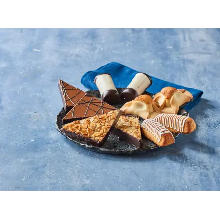 Fullbökuð vara Afþíðið við stofuhita í 1-2 klst. eða í kæli við 5°C í 4-6 klst. 25 bitar, 5 tegundir: Napoleonhat -55g Træstamme - 80g Kransekagestykke - 50g Nougattrekant - 65g Nöddetrekant -80g