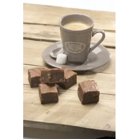 Súkkulaði Brownie sem inniheldur dökkt súkkulaði sem er 27% af kökunni og Pecan hnetur sem er 5% í kökunni, kemur skorin í 120 bita hver biti er 20 grömm, ekta súkkulaði brownie með Pecan hnetum. Afþíðið í 60 mín við 0-4°C
