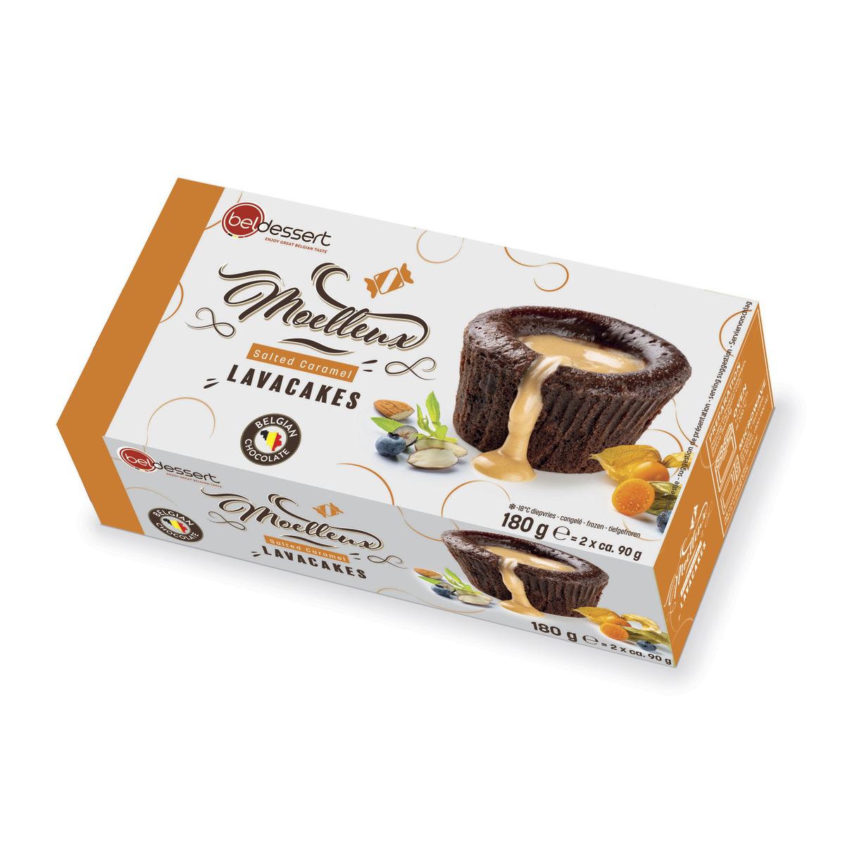Súkkulaðikaka úr ekta belgísku súkkulaði með fljótandi karamellu í miðju. 2x90gr kökur í pakka. Frosnar kökur bakist í 12-13 mínútur í 200°C heitum ofni. Afþýddar kökur bakist í 8-9 mínútur í 200°C heitum ofni.