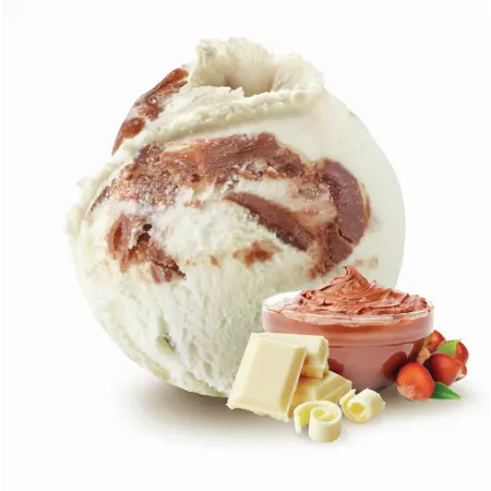 Rjómaís með hvítu súkkulaði, heslihnetum og kakó topping.
