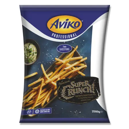 Franskar kartöflur extra stökkar og húðaðar 7 mm. Foreldaðar og snöggfrystar. Haldast stökkar lengi eftir eldun. Klárlega franskar fyrir sælkera. Djúpsteiking: 175°C 500g ca.3-3 1/2 mínúta. Fer eftir potti og olíu.