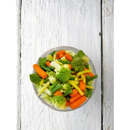 Stærð: Gulrætur <18mm, Baunir 40mm, Romanesco 20-40mm. Eldist beint úr frosti, meðhöndlið eins og ferskt grænmeti með styttri eldunartíma. Ekki ráðlegt að frysta aftur eftir að vara hefur verið afþiðin.