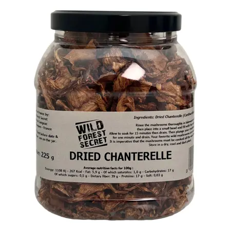 Þurrkaðir Chanterelles sveppir. Hreinsið sveppina í volgu vatni, setjið síðan í ská og fyllið með heitu vatni. Látið liggja í 15 mín og hellið vatni af. Síðan gott að setja sveppina í heitt vatn í 1 mínútu og látið leka af. Þá eru sveppirnir tilbúnir til matreiðslu.