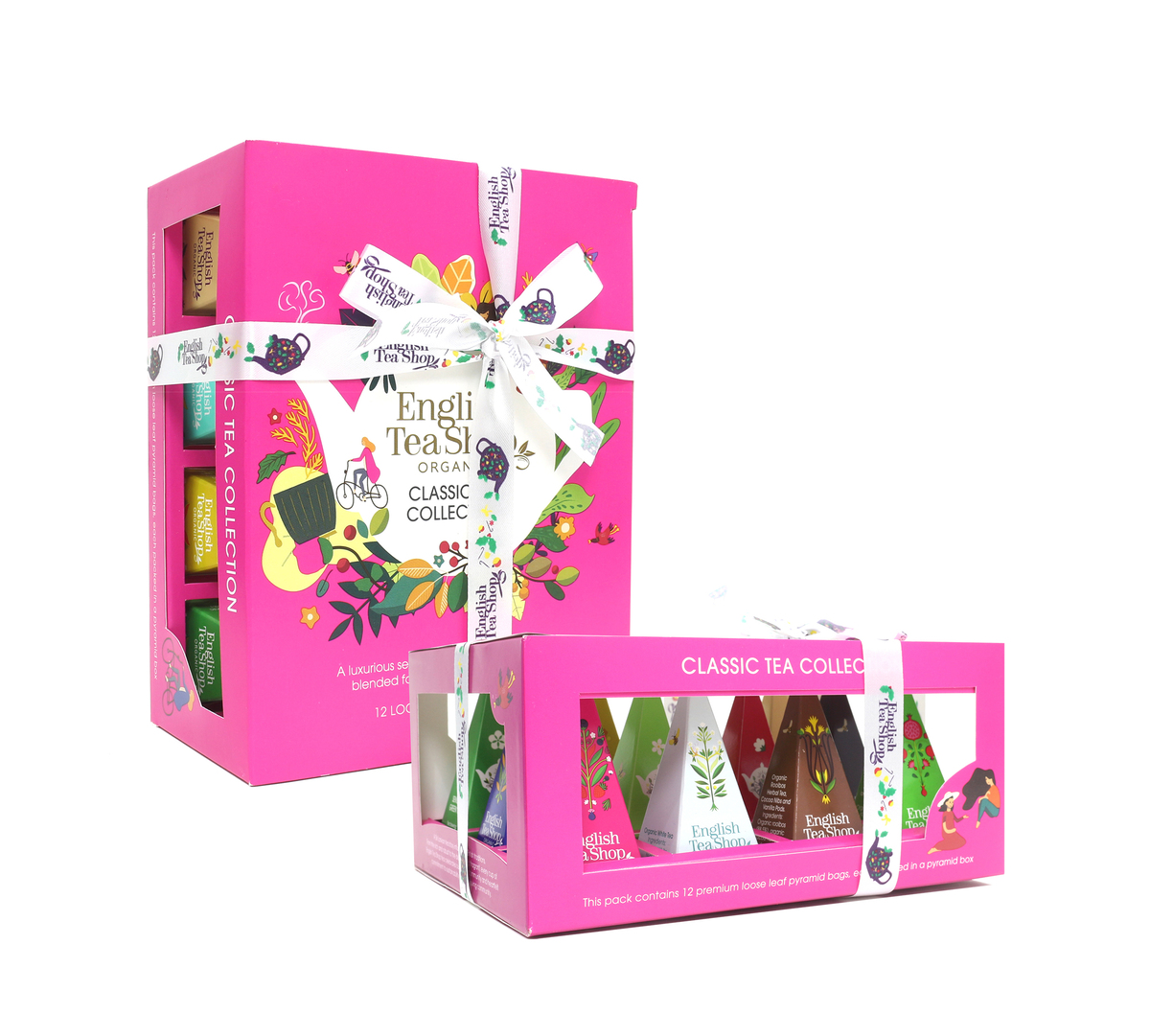 Gegnsæjar gjafaöskjur með 12 silkipýramídum sérinnpökkuðum í litla kassa. (Green Tea Pomegranate, Chocolate Rooibos & Vanilla, White Tea, Super Berries, Earl Grey, English Breakfast, Calming Blend, Ginger Peach Tea, Green Tea Tropical, Peppermint, Lemongrass Ginger & Citrus, Japanese Green Sencha)