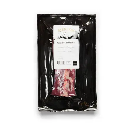 Hreindýra Entrecote ca. 200 - 300 g í pakkningunni. Stensaas er fjölskyldufyrirtæki sem í margar kynslóðir hefur framleitt hreint og hollt hreindýrakjöt úr dýrum er lifa í ósnortnum fjöllum og heiðum í kringum Røros í Noregi. Dýrin eru úr hjörðum Sama sem ala dýrin eftir sínum aldagömlu 8 árstíða hefðum er byggja á náttúrulegum árstíðabundnum flutningi hreindýranna milli beitarlanda.