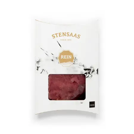 Hreindýra rumpsteik ca. 1 kg í pakkningunni. Stensaas er fjölskyldufyrirtæki sem í margar kynslóðir hefur framleitt hreint og hollt hreindýrakjöt úr dýrum er lifa í ósnortnum fjöllum og heiðum í kringum Røros í Noregi. Dýrin eru úr hjörðum Sama sem ala dýrin eftir sínum aldagömlu 8 árstíða hefðum er byggja á náttúrulegum árstíðabundnum flutningi hreindýranna milli beitarlanda.
