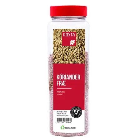 Fræ af kóríander plöntu. Best bragðið fæst með því að rista þau á pönnu áður en þau eru mulin. Kryta er danskt fyrirtæki sem var stofnað árið 1955. Það býður upp á fjölbreytt úrval af hreinum kryddum, kryddblöndum og heilum kryddum. Til að tryggja gæðin vinnur Kryta í nánu samstarfi við sína birgja og ferðast reglulega til að skoða ræktun og framleiðslu. Miklar kröfur eru gerðar til þess að vörur þeirra séu ræktaðar og meðhöndlaðar á réttan hátt og við réttar aðstæður til að ná fram sem bestum gæðum.