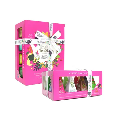 Gegnsæjar gjafaöskjur með 12 silkipýramídum sérinnpökkuðum í litla kassa. (Green Tea Pomegranate, Chocolate Rooibos & Vanilla, White Tea, Super Berries, Earl Grey, English Breakfast, Calming Blend, Ginger Peach Tea, Green Tea Tropical, Peppermint, Lemongrass Ginger & Citrus, Japanese Green Sencha)