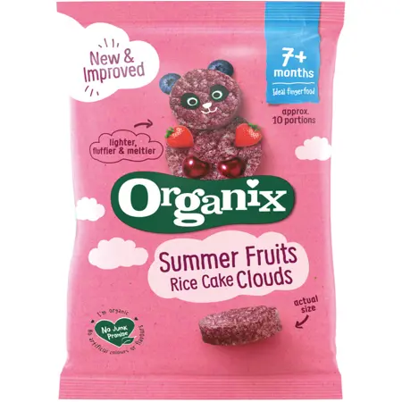 Fyrir börn frá 7 mánaða aldri. Fullkomin stærð fyrir litla fingur. Kökurnar eru nógu stífar til að molna ekki en mjúkar fyrir litla góma. Í kökurnar eru bætt safa úr ávöxtum en engum aukaefnum sem á við um allar vörur frá ORGANIX.