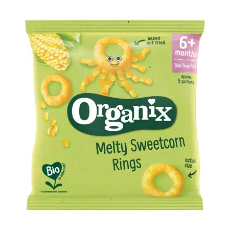 Fyrir börn frá 6 mánaða aldri. Framleitt úr lífrænum maís, létt og bragðgott snakk fyrir vaxandi börn. Fjölbreytt form snakksins hjálpar barninu við að æfa samhæfingu milli augna og handa.