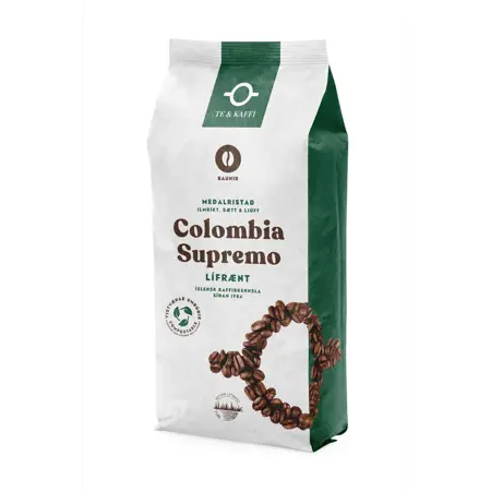 Colombia Supremo er lífrænt vottað kaffi frá Te & Kaffi. Kaffið hefur náttúrulegan hnetukeim, mikla fyllingu og er í mjög góðu jafnvægi. Meðalristað, ilmríkt, sætt og ljúft. Lífrænar umbúðir og umhverfisvæn kaffibrennsla Umbúðirnar frá Te & Kaffi eru lífrænar og flokkast því í lífrænu tunnuna. Te & Kaffi ristar allt sitt kaffi á umhverfisvænan hátt með metangasi en metangas verður til úr lífrænum heimilisúrgangi. Te & Kaffi er því hægt og rólega að færa sig yfir í hringrásarhagkerfið en með þessari aðgerð núllast út nánast öll bein kolefnislosun á vegum Te & Kaffi á Íslandi.