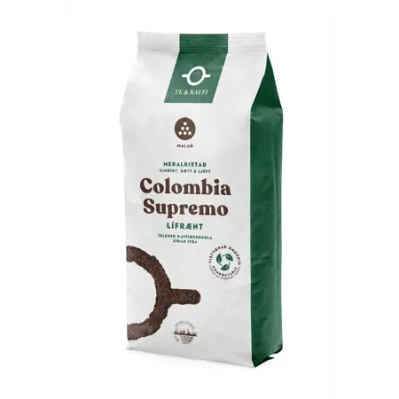 Colombia Supremo er lífrænt vottað kaffi frá Te & Kaffi. Kaffið hefur náttúrulegan hnetukeim, mikla fyllingu og er í mjög góðu jafnvægi. Meðalristað, ilmríkt, sætt og ljúft. Lífrænar umbúðir og umhverfisvæn kaffibrennsla Umbúðirnar frá Te & Kaffi eru lífrænar og flokkast því í lífrænu tunnuna. Te & Kaffi ristar allt sitt kaffi á umhverfisvænan hátt með metangasi en metangas verður til úr lífrænum heimilisúrgangi. Te & Kaffi er því hægt og rólega að færa sig yfir í hringrásarhagkerfið en með þessari aðgerð núllast út nánast öll bein kolefnislosun á vegum Te & Kaffi á Íslandi.