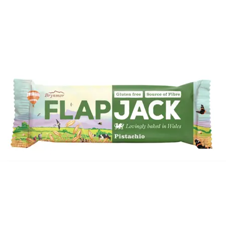 FlapJack er velskt merki sem leggur áherslu á að gera heilnæma hafrabari sem eru glútenlausir, trefjaríkir og seðjandi grænmetisfæði. Flapjack með pistasíum er vegan og glútenlaus