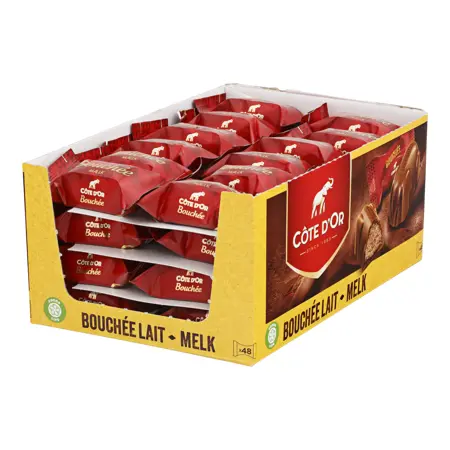 Ljúffengt Côte d'Or mjólkursúkkulaði með mjúkri pralínfyllingu. 48 stk af innpökkuðum 25 g súkkulaðistykkjum í kassa.