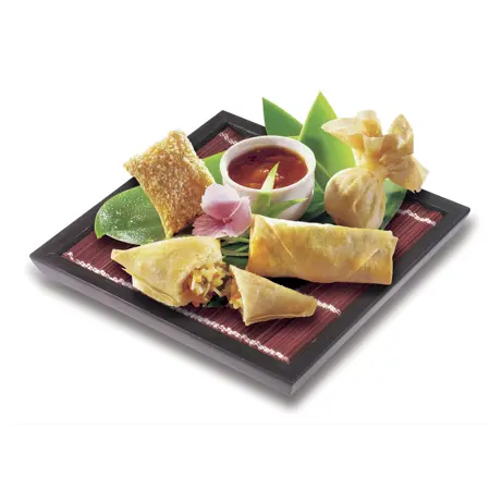 Fullelduð vara. Hitað í ofni við 200°C í 13-15 mín í forhituðum ofni. Djúpsteik við 108°C í ca3.3 mínútur. 80 stk í kassa 20-SHRIMP SESAME WANTAN Sesam dough bag filled with juicy pieces of shrimp and refined with aromatic coriander. 20-CHIK’N MONEY BAG A real eyecatcher! Thin dough bag filled with tender chicken, cabbage, and prawns. 20-DUCK SPRING ROLL Dough roll filled with duck meat, onions, and spring onions with Asian Hoisin sauce. 20-VEGETABLE THAI SAMOSA Fine glass noodles, vegetables, and a hint of lemon grass make these little samosas from Thailand a special delight for any fan of Asian food.