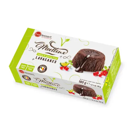 VEGAN súkkulaðikaka úr dökku belgísku súkkulaði með fljótandi súkkulaði miðju. 2x90gr kökur í pakka. Frosnar kökur bakist í 12-13 mínútur í 200°C heitum ofni Afþýddar kökur bakist í 8-9 mínútur í 200°C heitum ofni