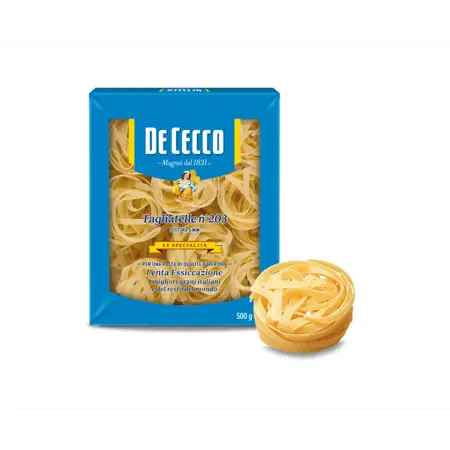 Eldunartími er 5 mínútur. De Cecco fyrirtækið hefur framleitt hágæða pasta síðan 1886. Það sem gerir pastað einstakt frá De Cecco er nákvæmnin, reynslan og gæðin sem finna má á hverju stigi framleiðslunnar.