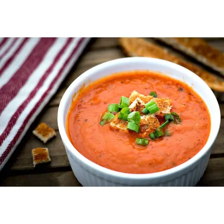 Þarf aðeins að hita. Tveir pokar passa fullkomlega í gastro bakka og hentar vel að setja á 15 mínútur á gufu. Einnig hægt að afþýða undir heitu vatni. Fullelduð og freistandi paprikusúpa með tómat og hvítlauk, sem þarf aðeins að hita.