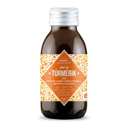Lífrænt túrmerikskot frá Organic Human. Túrmerik inniheldur curcumin sem er afar öflugt andoxunarefni sem vinnur á bólgum í líkamanum. Það hlutleysir sindurefni og örvar líkamann til að framleiða andoxandi ensím. Þessi blanda af túrmerik, engifer, hafþyrniberjum, appelsínum og eplum er einstaklega öflug blanda með fersku appelsínubragði.