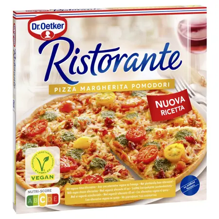 Þunnur, stökkur botni, ljúffeng fyllingin og sérvalin innihaldsefnin gera Dr. Oetker Ristorante Pizza ómótstæðilega. Pítsan bragðast eins og hún hafi verið gerð á ítölskum veitingastað. Prófaðu Dr. Oetker Ristorante vegan pizzuna með aromatískri tómatasósu, krisuberjatómötum, vegan osti og basil. Einstaklega ljúffeng vegan pizza. Hitið ofn í 220°C. Setjið pizzuna frosna í ofninn og bakið í 12-14 mínútur.
