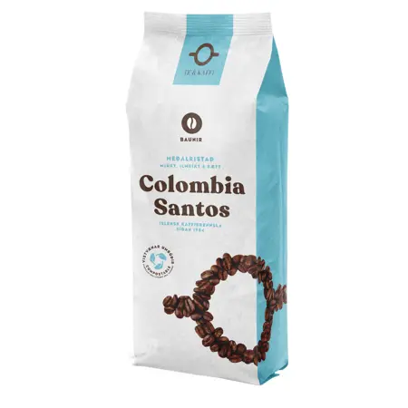 Colombia Santos frá Te & Kaffi er meðalristað kaffi. Sætleiki og mýkt frá Brasilíu ásamt úrvals Kólumbíukaffi gerir þessa blöndu sérstaklega bragðgóða. Suður-Ameríka er þekkt fyrir kaffiræktun og þar er framleitt mikið af gæðakaffi. Há fjöll, frumskógar og einstakt loftslag mynda góð skilyrði fyrir kaffiræktun í heimsálfunni. Lífrænar umbúðir og umhverfisvæn kaffibrennsla Umbúðirnar frá Te & Kaffi eru lífrænar og flokkast því í lífrænu tunnuna. Te & Kaffi ristar allt sitt kaffi á umhverfisvænan hátt með metangasi en metangas verður til úr lífrænum heimilisúrgangi. Te & Kaffi er því hægt og rólega að færa sig yfir í hringrásarhagkerfið en með þessari aðgerð núllast út nánast öll bein kolefnislosun á vegum Te & Kaffi á Íslandi.