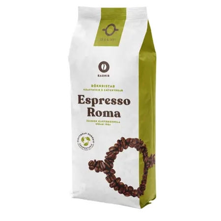 Í Espresso Roma frá Te & Kaffi eru sérvaldar baunategundir sem saman mynda gott jafnvægi, þéttleika og sérstakt bragð. Kaffið er í senn kraftmikið, sætkryddað og mjúkt. Espresso verður kröftugra en hefðbundið uppáhellt kaffi og er undirstaða margra kaffidrykkja, svo sem latte og cappuccino. Lífrænar umbúðir og umhverfisvæn kaffibrennsla Umbúðirnar frá Te & Kaffi eru lífrænar og flokkast því í lífrænu tunnuna. Te & Kaffi ristar allt sitt kaffi á umhverfisvænan hátt með metangasi en metangas verður til úr lífrænum heimilisúrgangi. Te & Kaffi er því hægt og rólega að færa sig yfir í hringrásarhagkerfið en með þessari aðgerð núllast út nánast öll bein kolefnislosun á vegum Te & Kaffi á Íslandi.