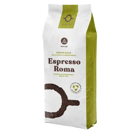 Í Espresso Roma frá Te & Kaffi eru sérvaldar baunategundir sem saman mynda gott jafnvægi, þéttleika og sérstakt bragð. Kaffið er í senn kraftmikið, sætkryddað og mjúkt. Espresso verður kröftugra en hefðbundið uppáhellt kaffi og er undirstaða margra kaffidrykkja, svo sem latte og cappuccino. Lífrænar umbúðir og umhverfisvæn kaffibrennsla Umbúðirnar frá Te & Kaffi eru lífrænar og flokkast því í lífrænu tunnuna. Te & Kaffi ristar allt sitt kaffi á umhverfisvænan hátt með metangasi en metangas verður til úr lífrænum heimilisúrgangi. Te & Kaffi er því hægt og rólega að færa sig yfir í hringrásarhagkerfið en með þessari aðgerð núllast út nánast öll bein kolefnislosun á vegum Te & Kaffi á Íslandi.