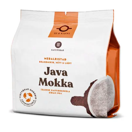 Java Mokka er meðalristuð blanda frá Te & Kaffi en kaffið tengir góða mýkt og fyllingu frá Indónesíu við bjarta tóna Afríku sem gefur kaffinu einstakt jafnvægi. Lífrænar umbúðir og umhverfisvæn kaffibrennsla Umbúðirnar frá Te & Kaffi eru lífrænar og flokkast því í lífrænu tunnuna. Te & Kaffi ristar allt sitt kaffi á umhverfisvænan hátt með metangasi en metangas verður til úr lífrænum heimilisúrgangi. Te & Kaffi er því hægt og rólega að færa sig yfir í hringrásarhagkerfið en með þessari aðgerð núllast út nánast öll bein kolefnislosun á vegum Te & Kaffi á Íslandi.