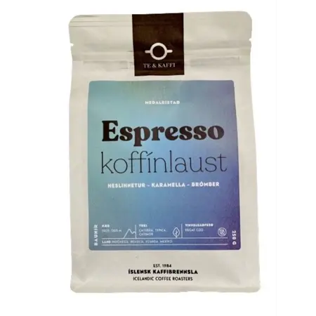 Koffínlaust malað kaffi frá Te & Kaffi sem á uppruna sinn að rekja til Indónesíu, Brasilíu, Rúanda og Mexíkó. Bragðmikið, þétt & kröftugt en hér er um blöndu af heslihnetum, karamellu og brómberjum að ræða. Koffínlaust Espresso kaffið frá Te & Kaffi er meðalristað, með léttri ávaxtasýrni og kryddaðan ljúffengan keim. Nýjustu verkunaraðferðir eru notaðar við að framleiða það. Kaffið er einfaldlega látið liggja í bleyti "Swiss Water" áður en það er þurrkað aftur og er tilbúið til flutninga. Swiss Water aðferðin er þekkt fyrir leysa koffínið úr kaffinu í gegnum náttúruleg ferli án þess að nota skaðleg efni af neinu tagi.