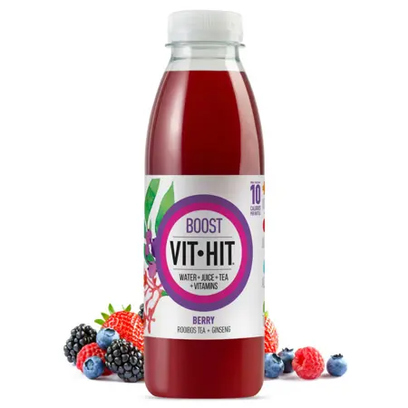 Ljúffeng blanda af frískandi berjum og kraftmiklu engifer ásamt heilnæmu rauðrunnatei. Inniheldur ráðlagðan dagskammt af 8 vítamínum og aðeins 10 hitaeiningar.