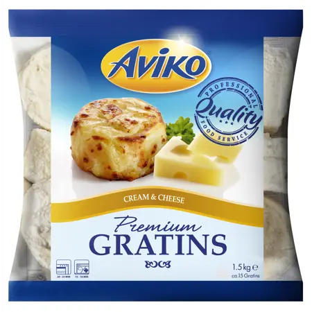 Kartöflugratin klattar með rjóma og Emmental osti. Snöggfryst og tilbúnið í ofninn. Innihald: Kartöflur, rjómi (45%) Emmental ostur (7%). 15 stk. .í poka hver klatti 100gr. Í ofni:220°C í 20-25 mín Combistream 200°C,15-18 mín. Gott að hafa klattana dreifða á bökunarplötu og staðsetja hana fyrir miðjum ofni.