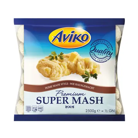 Eins og heimagerð kartöflumús unnin úr ferskum kartöflum og snögg fryst. Innhald: kartöflur, mjók 18%, smjör 5%, salt og krydd. Eldun: Örbylgjuofn: 500g, 1350W, 4 mín, Blástursofn: 120°, 50% gufa, 12 mín. High speed cooker: 2500g, 100°C, 1 bar, 2 mín.