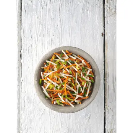 Stærð: Gulrótar strimlar 4x4mm, Celeriac strimlar 4x4mm,. Blaðlaukur +-6mm. Eldist beint úr frosti, meðhöndlið eins og ferskt grænmeti með styttri eldunartíma. Ekki ráðlegt að frysta aftur eftir að vara hefur verið afþiðin.