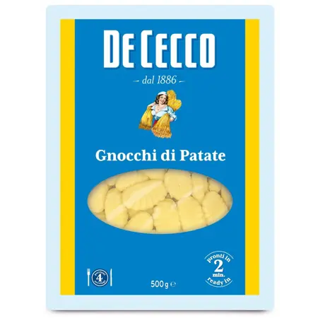 Kartöflu gnocchi er dæmigerður réttur í hefð ítalskrar matargerðar sem á mismunandi svæðum getur verið mismunandi í lögun og stærð deigsins. De Cecco býður þér bragðgóða vöru sem er upprunnin úr klassískri uppskrift sem sameinar valdar kartöflur og hveiti. Munurinn er að þær taka aðeins 2 mínútur að elda. Mismunandi lögun þeirra er hönnuð til að gera þau að fullkomnu vali til að útbúa aðlaðandi rétti á hverjum degi; allt frá uppskriftum með kjötsósu eða pestói, upp í frumlegri og hugmyndaríkari uppskriftir byggðar á flauelsmjúkum ostasósum eða einfaldari með bræddu smjöri, salvíu og rifnum parmesan. Fáanlegt í 500 g pakkningu.