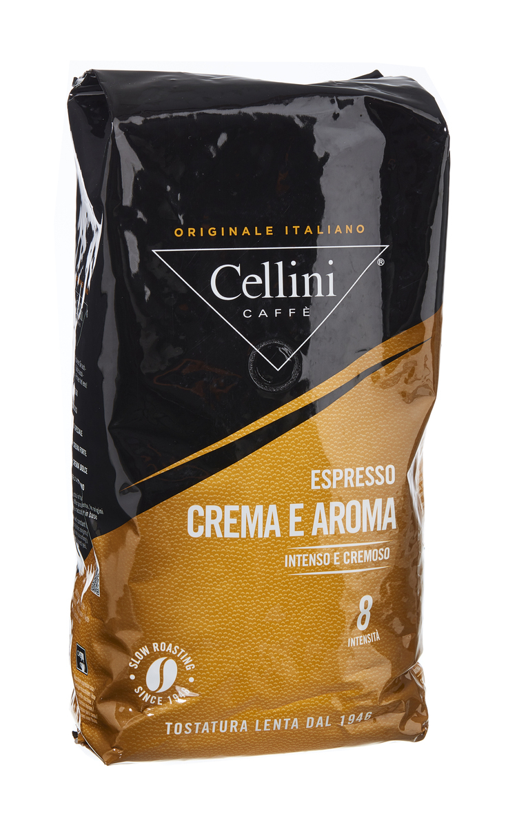 Cellini Crema E Aroma er 80% Arabica baunir og 20% Robusta baunir. Baunirnar eru dökkristaðar og bera með sér einstaklega bragðmikinn keim af karamellu og súkkulaði. Fyllingin í þessari blöndu er með eindæmum silkimjúk, „creman“ sem kemur á kaffið er þétt og mikil og hentar hún í alla kaffidrykki. Þessi blanda er ein sú vinsælasta á Ítalíu. Tostatura Lenta / Kaffibaunaristun:: Allar baunategundir sem frá Cellini koma eru ristaðar eftir þessari aðferð, en hún felur í sér að baunirnar eru ristaðar á mjög mjúkan og hægan hátt í tromlu. Ferlið fer fram við 210-220°hita og tekur um 14-16 mínútur. Þessi aðferð tryggir að allar baunirnar ristast á jafnan hátt, sem síðar skilar sér í hárnákvæmum og jöfnum gæðum.