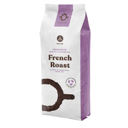 French Roast er dökkristað kaffi frá Te & Kaffi með löngu og miklu eftirbragði. Frönsk brennsla stendur fyrir ákveðið brennslustig þar sem kaffið er dökkristað og við það breytast bragðeiginleikar þess. Sykrurnar í bauninni brúnast meira og kaffið verður því skarpara og ilmríkara. LLífrænar umbúðir og umhverfisvæn kaffibrennsla Umbúðirnar frá Te & Kaffi eru lífrænar og flokkast því í lífrænu tunnuna. Te & Kaffi ristar allt sitt kaffi á umhverfisvænan hátt með metangasi en metangas verður til úr lífrænum heimilisúrgangi. Te & Kaffi er því hægt og rólega að færa sig yfir í hringrásarhagkerfið en með þessari aðgerð núllast út nánast öll bein kolefnislosun á vegum Te & Kaffi á Íslandi.