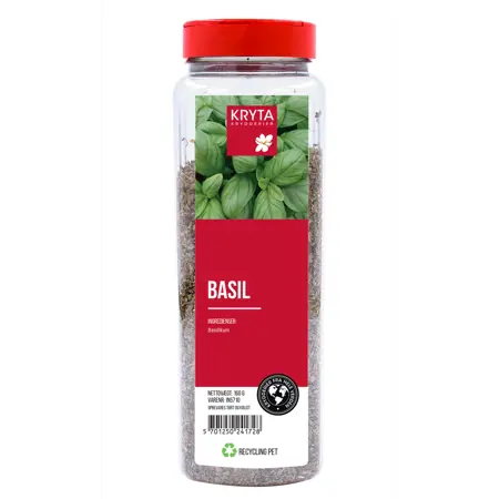 Basillauf skorin. Gefur ítölskum réttum þetta klassíska bragð. Pestó, spaghettisósa, tómatasósa, pizza, brauð, fyllingar og fleira. Bætið basillaufinu út í, í byrjun en geymið 1/4 af magninu þar til í lokin. Fyrir extra basil bragð, myljið laufin fyrst. Kryta er danskt fyrirtæki sem var stofnað árið 1955. Það býður upp á fjölbreytt úrval af hreinum kryddum, kryddblöndum og heilum kryddum. Til að tryggja gæðin vinnur Kryta í nánu samstarfi við sína birgja og ferðast reglulega til að skoða ræktun og framleiðslu. Miklar kröfur eru gerðar til þess að vörur þeirra séu ræktaðar og meðhöndlaðar á réttan hátt og við réttar aðstæður til að ná fram sem bestum gæðum.