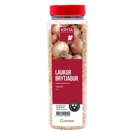 Brytjaður laukur í ca. 2-4 mm Kryta er danskt fyrirtæki sem var stofnað árið 1955. Það býður upp á fjölbreytt úrval af hreinum kryddum, kryddblöndum og heilum kryddum. Til að tryggja gæðin vinnur Kryta í nánu samstarfi við sína birgja og ferðast reglulega til að skoða ræktun og framleiðslu. Miklar kröfur eru gerðar til þess að vörur þeirra séu ræktaðar og meðhöndlaðar á réttan hátt og við réttar aðstæður til að ná fram sem bestum gæðum.
