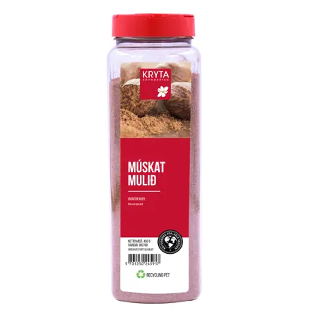 Múskatkrydd er kjarninn eða steinnin í múskat aldininu. Múskat hefur sterkt og sætt bragð og er hentugt krydd fyrir ostarétti, mjólkursósur og margt fleira. Kryta er danskt fyrirtæki sem var stofnað árið 1955. Það býður upp á fjölbreytt úrval af hreinum kryddum, kryddblöndum og heilum kryddum. Til að tryggja gæðin vinnur Kryta í nánu samstarfi við sína birgja og ferðast reglulega til að skoða ræktun og framleiðslu. Miklar kröfur eru gerðar til þess að vörur þeirra séu ræktaðar og meðhöndlaðar á réttan hátt og við réttar aðstæður til að ná fram sem bestum gæðum.