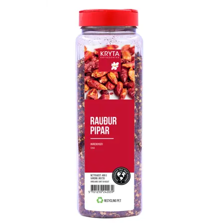 Mulinn þurrkaður chilipipar. Sterkur. Hentar vel í pottrétti, kryddblöndur og marineringar. Kryta er danskt fyrirtæki sem var stofnað árið 1955. Það býður upp á fjölbreytt úrval af hreinum kryddum, kryddblöndum og heilum kryddum. Til að tryggja gæðin vinnur Kryta í nánu samstarfi við sína birgja og ferðast reglulega til að skoða ræktun og framleiðslu. Miklar kröfur eru gerðar til þess að vörur þeirra séu ræktaðar og meðhöndlaðar á réttan hátt og við réttar aðstæður til að ná fram sem bestum gæðum.