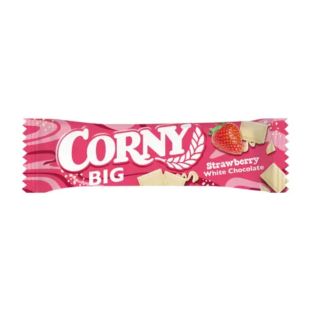 Corny Big með jarðarberjum og hvítu súkkulaði.