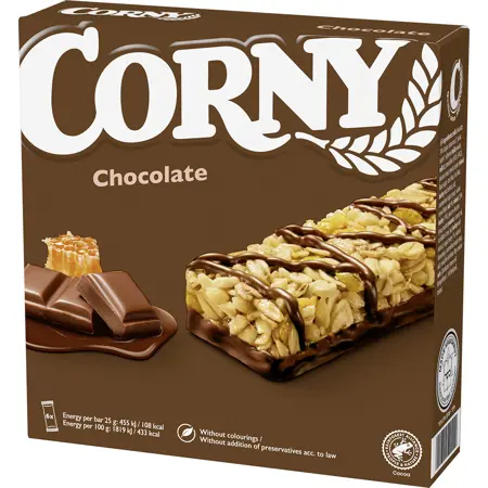 Corny með súkkulaði. Gert úr bragðgóðum hnetum, korni og súkkulaði.
