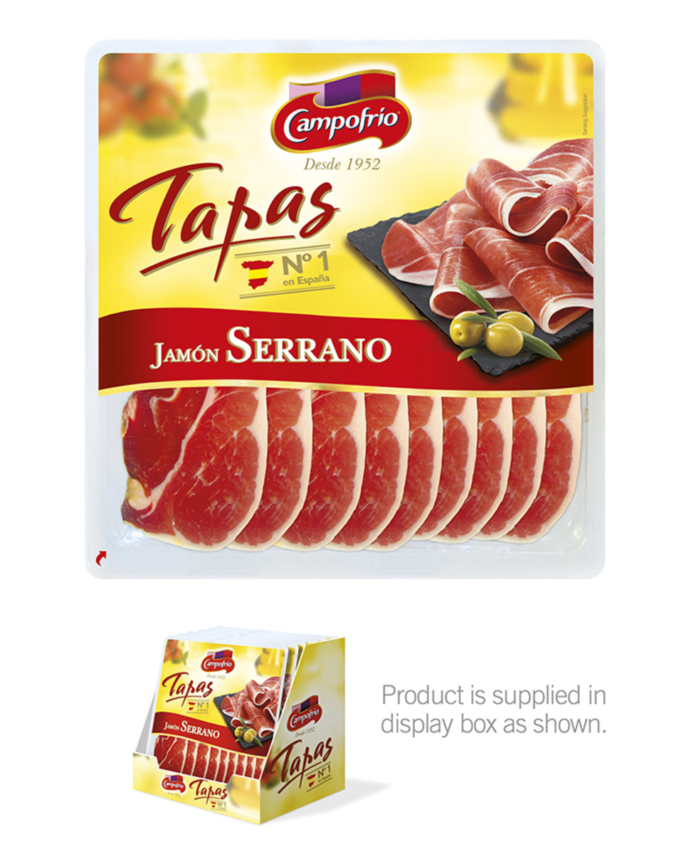 Serrano spænsk niðursneidd hráskinka. Tilbúin á tapas plattann.