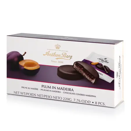 Marsipan tertur, plómur í Madeiara víni. 8 innpakkaðir molar í öskju