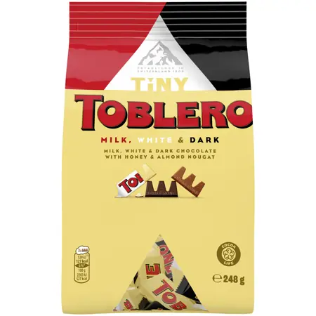 Toblerone vörumerkið og lögun þess er löngu orðin heimsþekkt. Toblerone er gott eitt og sér og frábært í uppskriftir. Fáðu hugmyndir að uppskriftum með Toblerone á gerumdaginngirnilegan.is Í hverjum 248 gr poka eru 31 stk af 8gr Toblerone molum.