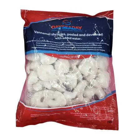 Vannamei rækja pilluð og hreinsuð. Íshúðuð vara, net þyngd 750 g.