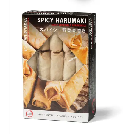 Spicy Harumaki eru handrúllaðar vorrúllur fylltar með japanskri grænmetisfyllingu og glernúðlum. 36 rúllur í pakka.