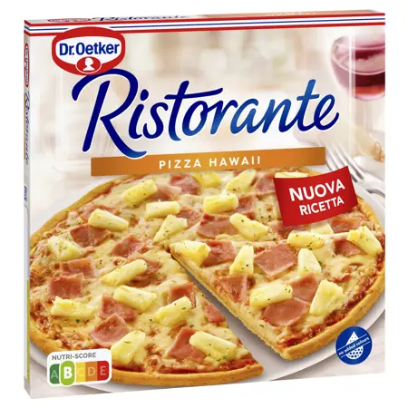Þunnur, stökkur botni, ljúffeng fyllingin og sérvalin innihaldsefnin gera Dr. Oetker Ristorante Pizza ómótstæðilega. Pítsan bragðast eins og hún hafi verið gerð á ítölskum veitingastað. Prófaðu Dr. Oetker Ristorante Pizza Hawaii með bragðmikilli, arómatískri tómatasósu, ananasbitum, skinku, rifnum mozzarellaosti og steinselju. Hitið ofn í 220°C. Setjið pizzuna frosna í ofninn og bakið í 12-14 mínútur.