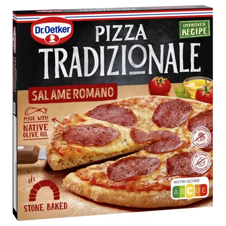 Við höfum gert Tradizionale pizzu enn betri! Við höfum lagt áherslu á ekta, ítalska tjáningu bæði í hönnun og smekk. Með nýrri uppskrift og enn betra hráefni hefur Dr. Oetker Tradizionale pizza nú orðið enn betri. Dr. Oetker Tradizionale Salami Romana er bökuð beint á steininum. Botninn er stökkur að utan og ljúffengur og loftgóður að innan. Pizzan er toppuð með bragðgóðu salami Spianata Romana og ljúffengum mozzarellaosti. Svona á ekta steinofnapizza að vera! Forhitið ofninn, undir og yfir hiti: 220 ° C, blástur: 200 ° C. (við mælum með undir og yfirhita) Fjarlægðu filmuna. Frosin pizzan er svo bökuð í 14-16 mínútur í miðjum ofni Vissirðu að „Spianata“ er þekkt í mörgum héruðum Ítalíu og frægust eru Spianata Romana (mild) og Spianata Calabrese (sterk)?